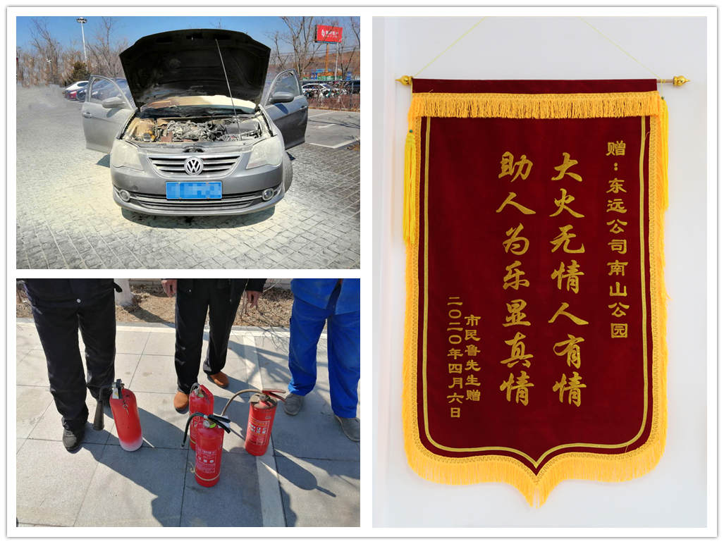 如果說陪伴是最長情的告白,那么“守護平安”則是景區(qū)保安隊員最恒久的承諾。當?shù)谝粫r間發(fā)現(xiàn)停車場內游客停放的車有煙冒出時,我們的保安隊員一邊打119報警,一邊迅速拿起滅火器跑到事發(fā)車輛前,不畏竄起的火苗在119到達之前將其撲滅。當游客得知情況匆匆忙忙跑下山看到眼前的一幕,緊緊的拉住保安隊員們的手連聲道著感謝,如果沒有及時給予處理不僅僅是自己車輛造成更嚴重的損失,也會給這滿山都是草木的南山公園造成不可估量的后果。事后游客送來錦旗表達感激之情。